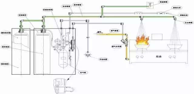 以往的廚房滅火系統(tǒng)是指針對(duì)廚房建筑物本身的滅火保護(hù)系統(tǒng),最常見的煙感、溫感探測系統(tǒng)和水噴淋系統(tǒng)等。由于廚房火災(zāi)多起因于灶臺(tái)用火失控,引燃集油煙罩和排煙管道內(nèi)的油垢釀成難以撲救的通天大火。因此,廚房的熱廚加工設(shè)備“灶臺(tái)、集油煙罩、排煙管道”就成為廚房內(nèi)的重點(diǎn)保護(hù)對(duì)象;而針對(duì)廚房熱廚加工設(shè)備實(shí)現(xiàn)“局部重點(diǎn)滅火保護(hù)”的系統(tǒng)稱為“廚房設(shè)備自動(dòng)滅火裝置”,它與廚房滅火系統(tǒng)是保護(hù)對(duì)象不同的兩個(gè)互相獨(dú)立、互不干擾的滅火保護(hù)系統(tǒng)。