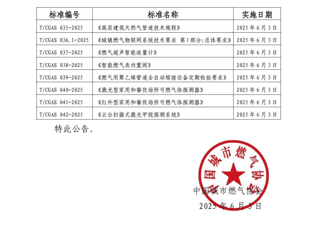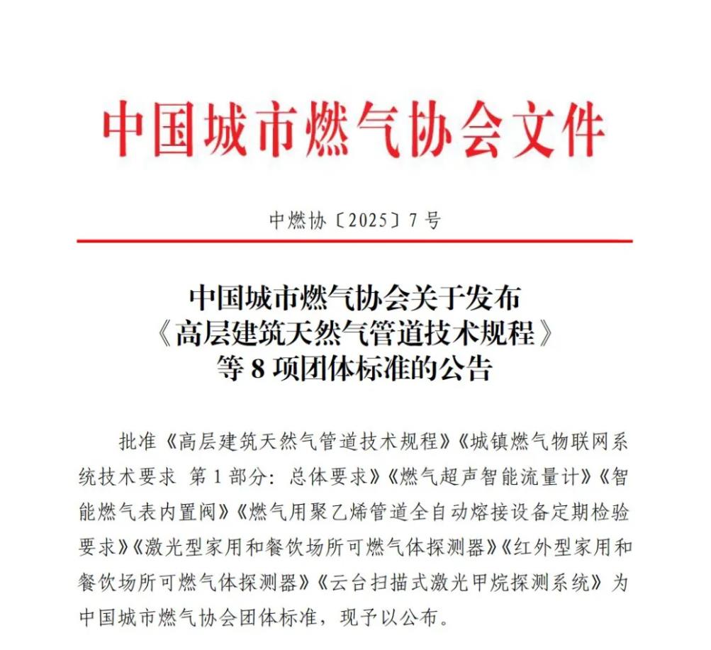 中國城市燃氣協(xié)會關于發(fā)布《高層建筑天然氣管道技術規(guī)程》等8項團體標準的公告