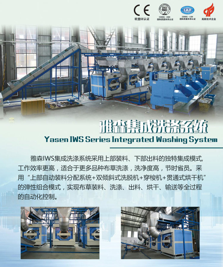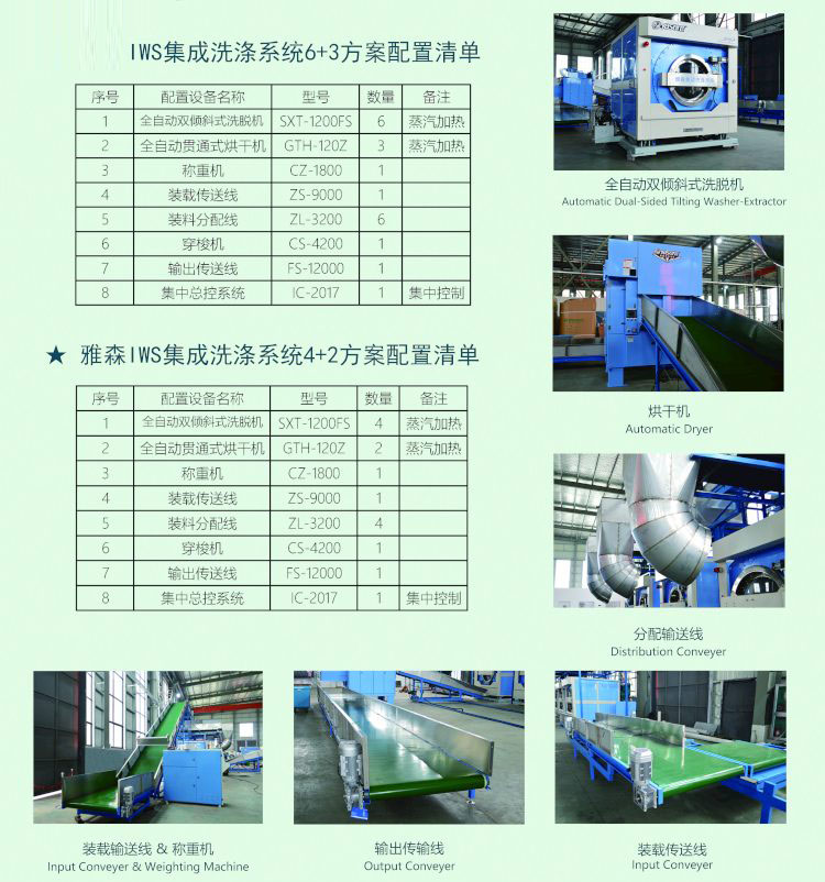 一、集成設(shè)備為高端5星級(jí)大酒店,大型水洗廠,大型三甲醫(yī)院和洗滌質(zhì)量要求很高,又需要高速、高效、節(jié)能、省時(shí)、省人工大規(guī)模洗滌的高端客戶(hù)專(zhuān)業(yè)設(shè)計(jì)制造。具有快速自動(dòng)進(jìn)料與自動(dòng)快速傾斜出料功能。