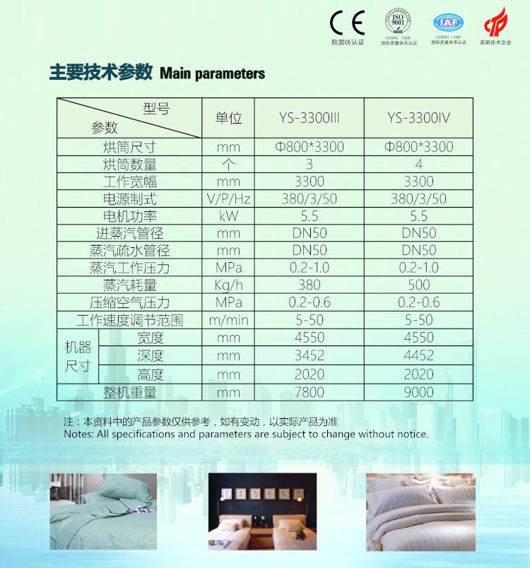 五、超高速脫水,脫去布草上更多水,縮短烘干和熨平時(shí)間,降低了工人工資,同時(shí)極大的降低了蒸汽和電費(fèi)耗量,提高了工作效率。